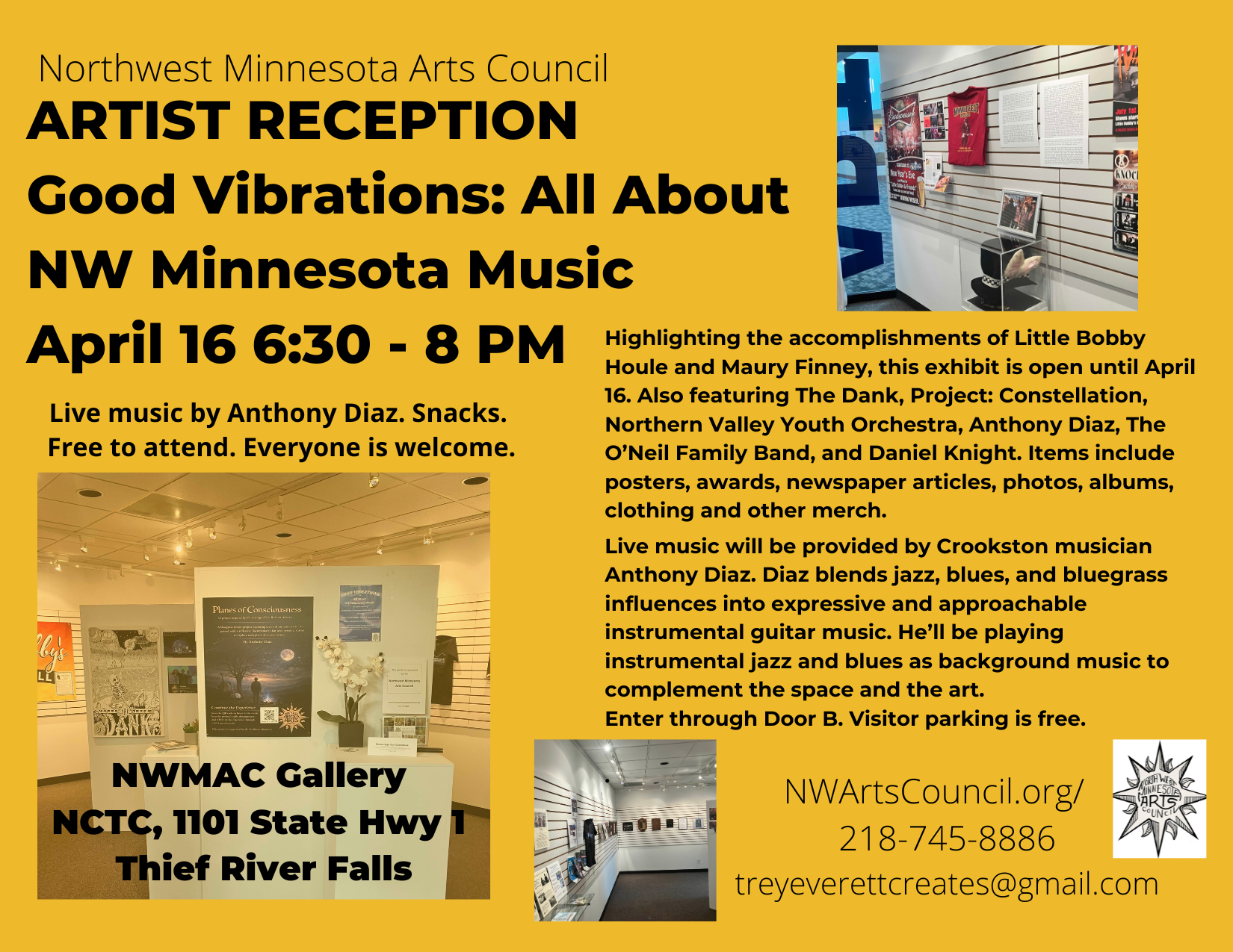 For more information about this exhibit or if you are an artist interested in exhibiting a body of work with NWMAC, please contact Trey Everett at (218) 280-4917 or email NWArtsCouncil@gmail.com. Please sign up for our e-newsletter on our website home page to see the latest news and grant announcements. Email director@NWArtsCouncil.org or call 218-745-8886 to reach our office during regular business hours.