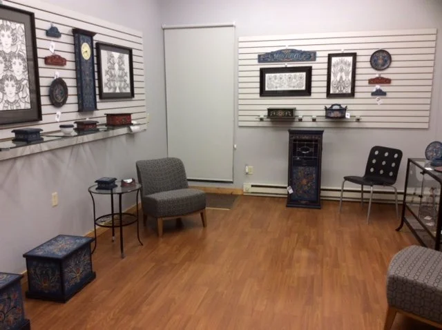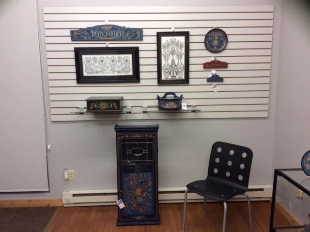 The Northwest Minnesota Arts Council (NWMAC) proudly presents Rosemaling and Drawings by Jean Honl, an exhibit of rosemaled wood items and original drawings from Ms. Honl's studio in northern Minnesota. This exciting exhibit opens Wednesday, August 31, 2016 and will be open to the public through Sunday September 25th in our gallery in East Grand Forks. Jean's interest in rosemaling began over 40 years ago when she enrolled in a rosemaling class offered through adult education classes. She "fell in love with the beautiful scrolls and flowers prevalent in this folk art," then her interest became more than a hobby. Jean traveled to the Norwegian American Museum in Decorah, Iowa three times to take rosemaling classes from the masters. Today, her beautiful works are found in many countries.Jean creates most of the wooden pieces she rosemals in her woodworking shop. She makes functional pieces including grandfather clocks, large cupboards and deacon’s benches, as well as the smaller items in the exhibit. More than able in carpentry, she also built her kitchen cabinets and a corner cabinet. Adding to her creativity, Jean draws designs on matt board, incorporating her favored scrolls with sweet symmetrical faces, or natural themes.