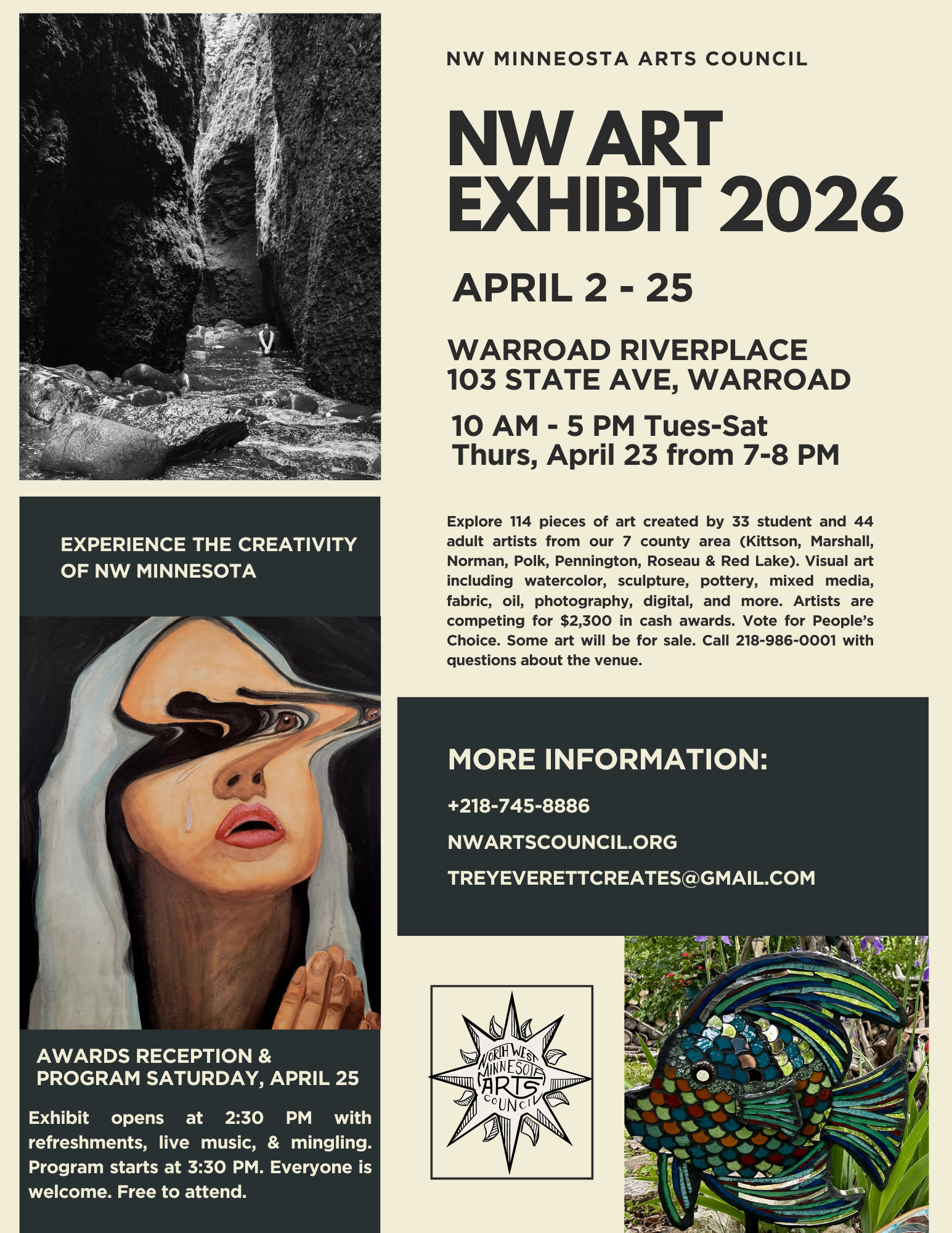 The Northwest Minnesota Arts Council is pleased to announce the NW Annual Art Exhibit will be at the Warroad RiverPlace starting April 2 until April 25.
