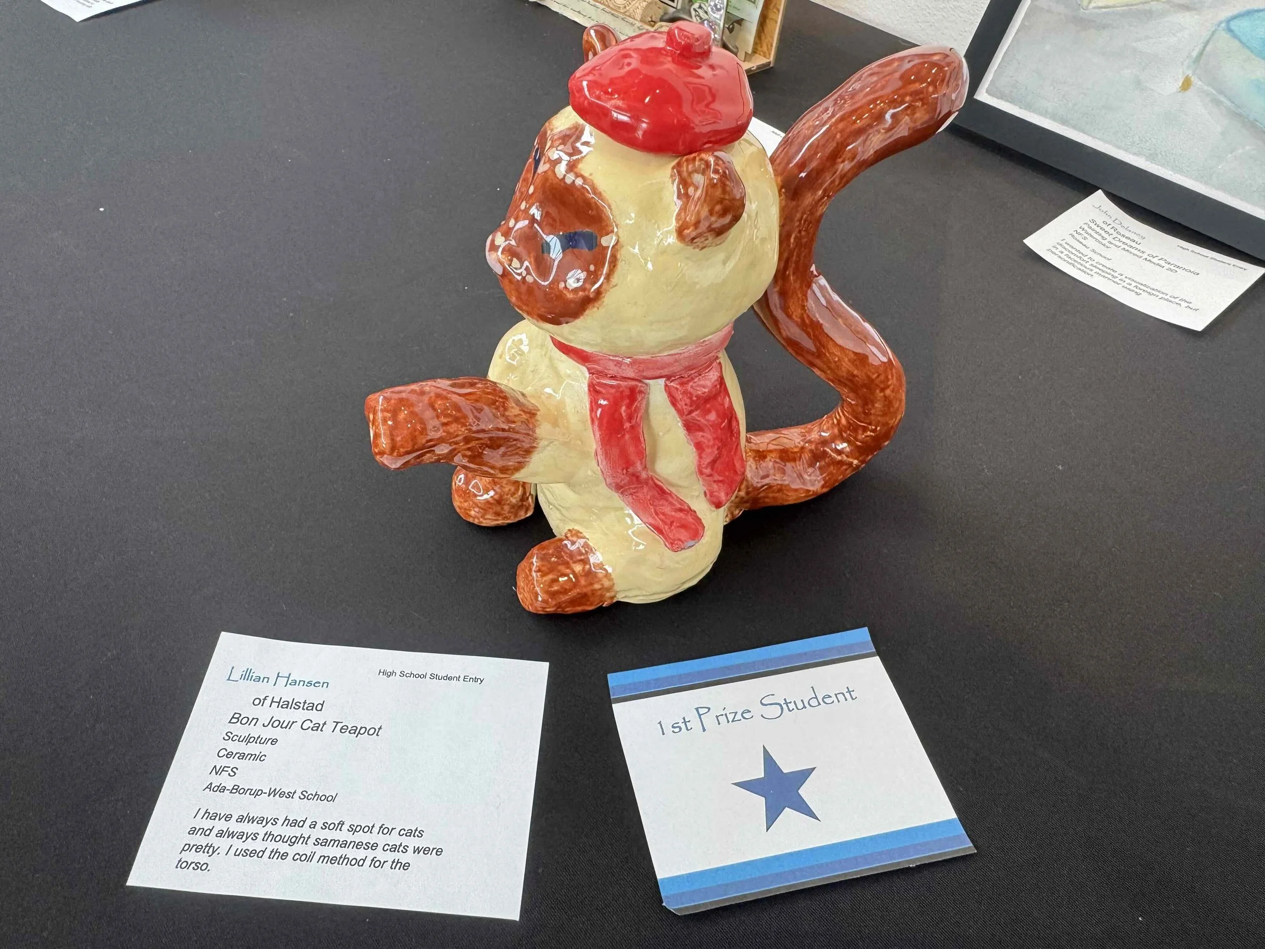 1st Place $300 Lillian Hansen of Halstad in ceramic sculpture for "Bon Jour Cat Teapot"