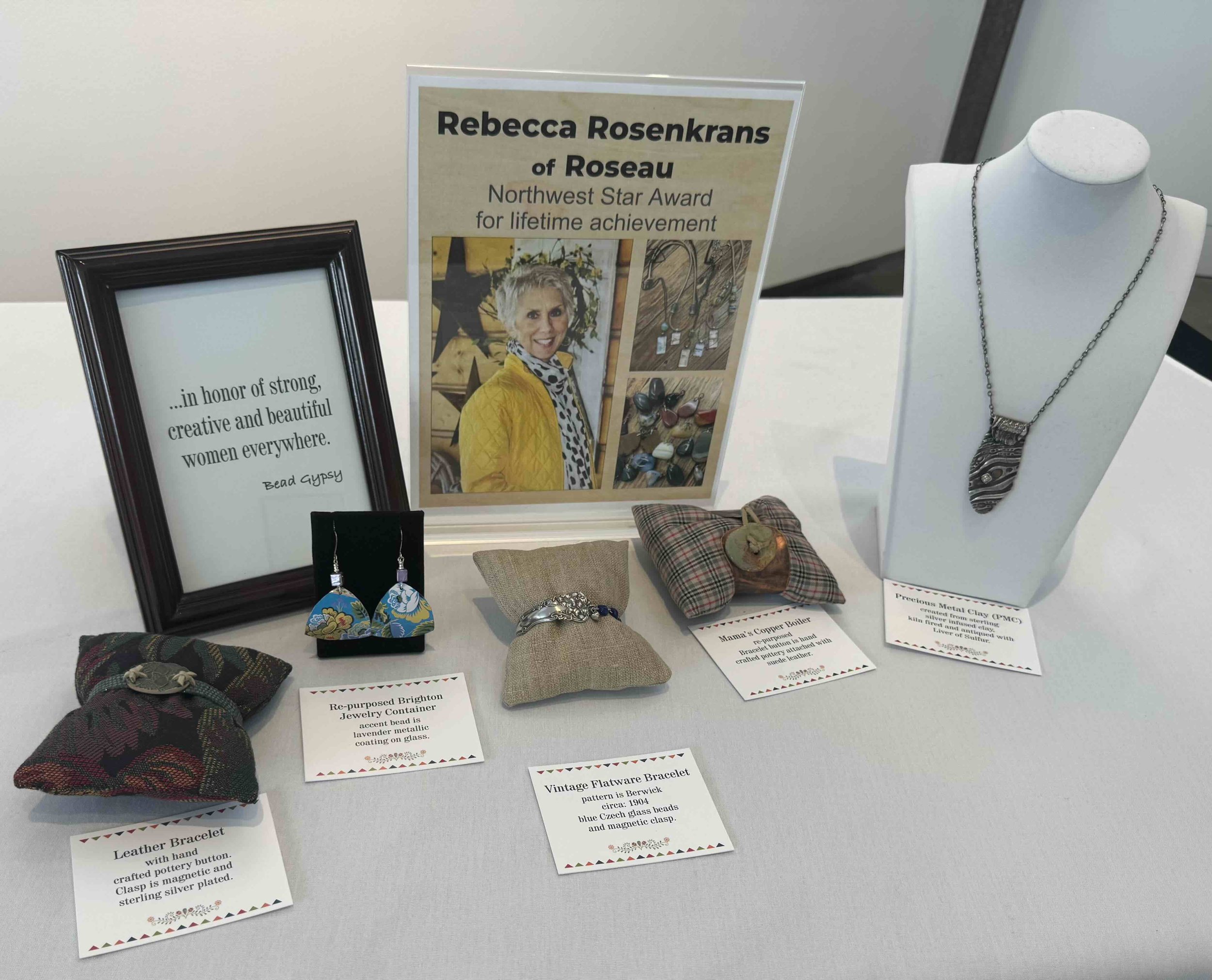 Rosenkrans was given the NW Star Award for her jewelry artistry. Rebecca (or Becky) has been creating one-of-a-kind jewelry for over 30 years. Becky handcrafts new pieces of jewelry or recreates old into new with Greek and Italian leather, beads, crafted chain maille, glass, stone, silver, crystal, and vintage goods. She readily shares her knowledge, creativity, and talents and is a tireless advocate for fellow artists. She is the owner of Bead Gypsy, a shop in Roseau where handmade goods and original art from over 20 artists are sold. The store is a haven for artists and arts lovers who live and visit the region.