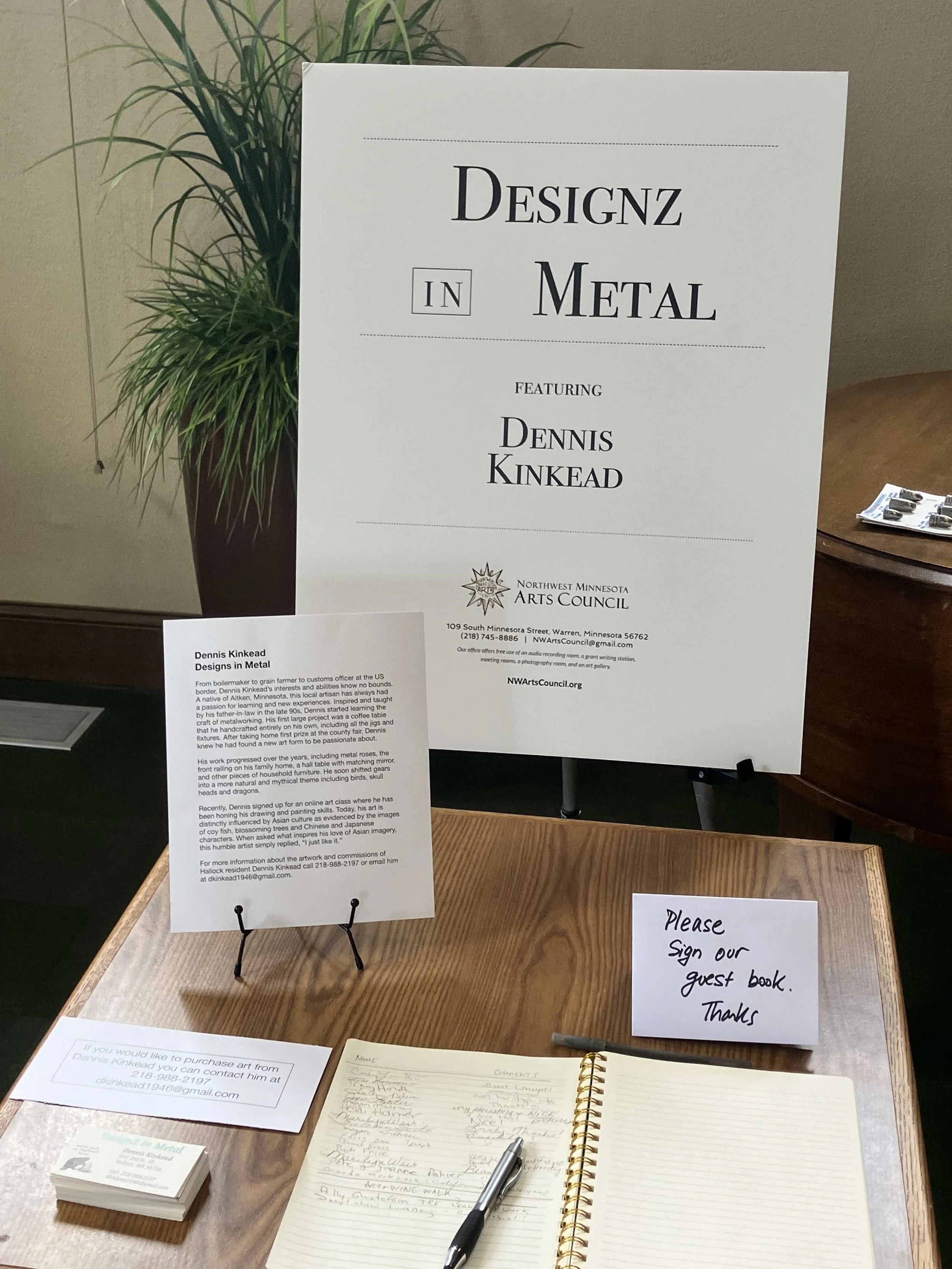 A number of works by Hallock metal artist and painter Dennis Kinkead will be featured in an upcoming exhibit at the Carnegie Library, 102 Main Ave N, in Thief River Falls. Kinkead’s work will open on Thursday, July 10 during Thief River Falls Art & Wine Walk. The artist will also be present during the event from 4 to 8 PM that evening. Everyone is welcome to attend this exhibit.