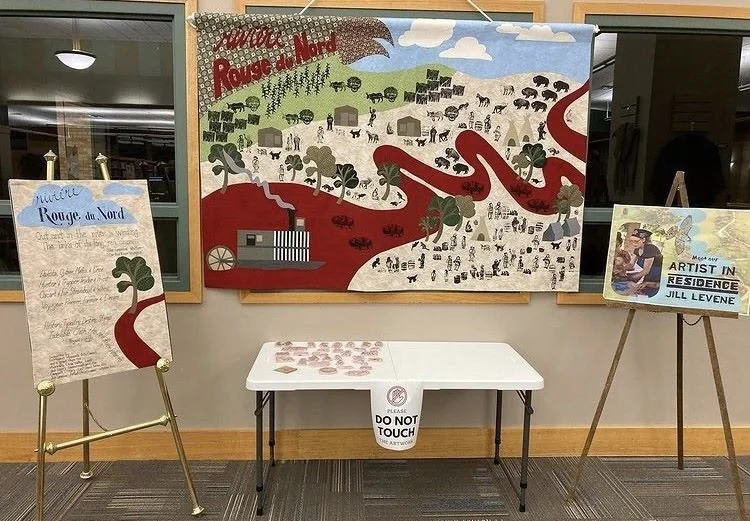 Pen and Ink drawings, baby swaddles to order, hand-printed dish towels, fabric art, mixed media, hand printed (block printing) including bandanas, aprons, baby onesies, and linen bread bags.